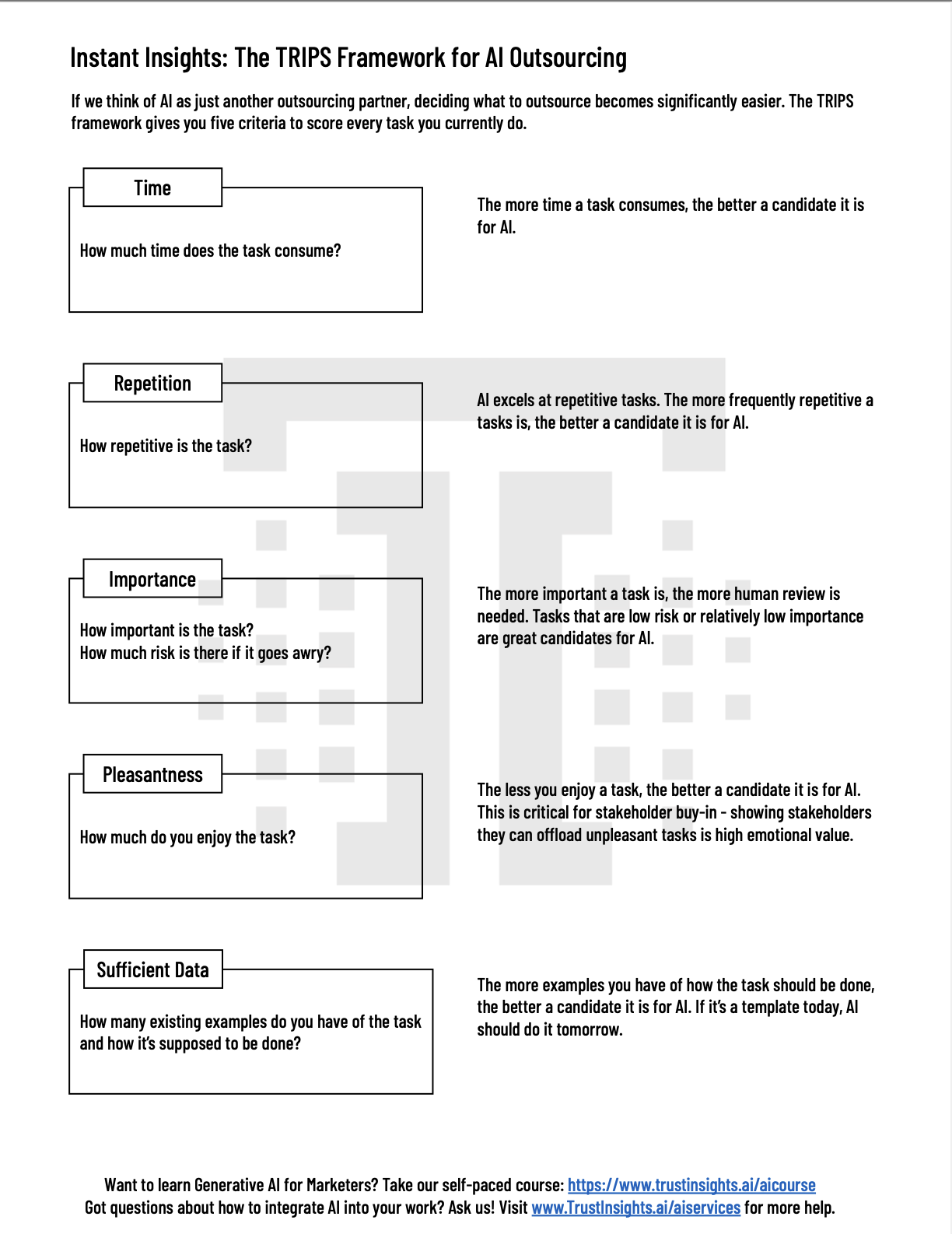 Here is an AI ‘Use Case’ Checklist that we are sharing with our clients and placed GameChanging leaders to help with engagement of employees. The TRIPS AI Checklist has five criteria, Time, Repetition, Importance, Pleasantness, and Sufficient Data.