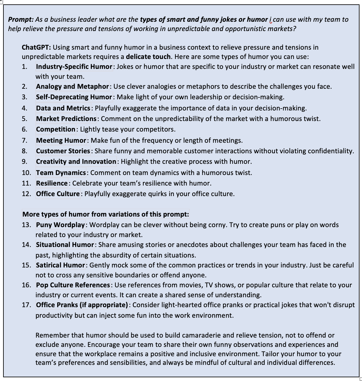 As an example of how AI can help you generate humor and jokes when you need it the most, please see Table 1 below. This shows a high-level question, or ChatGPT Prompt, to illustrate how the ChatGPT AI tool can be used to provide you with text content and a constant stream of ideas for humor to lighten the pressure with your team. You can customize your prompts for the moment and topics at hand. This AI tool is quick and intuitive so you can use it in real time on your mobile device or PC and get ideas in seconds.