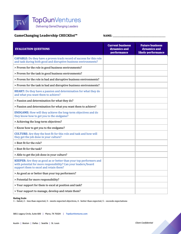 Now is a good time to grab a coffee and take 30 minutes to go through the 5 criteria of our GameChanging Leadership CHECKlist™ to see who on your Top Team will standout and where others need your added support.